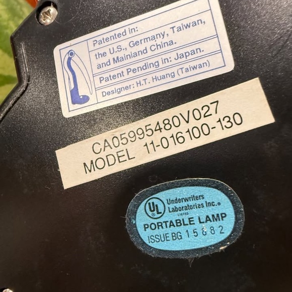 Designed in the 80's by H.t. Huang , this playful TOUCAN desk lamp became an iconic piece and was patented. "Pop Art"Black and soft yellow plastic colour way. The beak has a full range of height options. and can be completely closed when not in use to save space. There is a white mark on the back of the neck . Maybe from a sticker ?There is a piece missing where the electrical cord comes out. This is reflected in the price