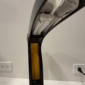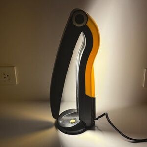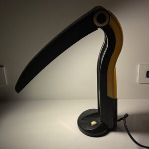 Designed in the 80's by H.t. Huang , this playful TOUCAN desk lamp became an iconic piece and was patented. "Pop Art"Black and soft yellow plastic colour way. The beak has a full range of height options. and can be completely closed when not in use to save space. There is a white mark on the back of the neck . Maybe from a sticker ? No cracks or chips. Hard to find in this condition
