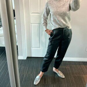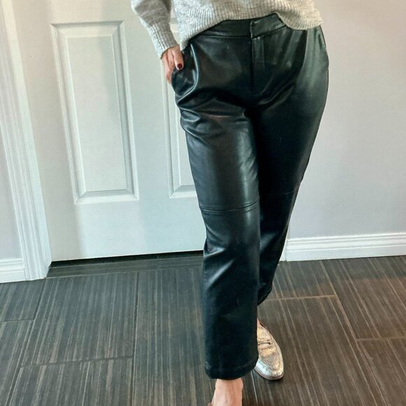 These are Hudson vegan leather pants and I only wore them a few times. They fit roomy on me and I purchased another pair that was more fitted. They are such great pants as they can be dressed down with sneakers, boots, flats OR dressed up with heels and blouse. These vegan leather pants are trendy BUT they are also classic and not going out of style for fall/winter 2024-25. Its also great if you are not a trend follower to purchase a more classic style which these are and pay a great price so you can wear them for a season or two and let them go. They do have a little stretch, with front pockets and fake pockets on the backside. I am "5"4 and they sit above my ankle.