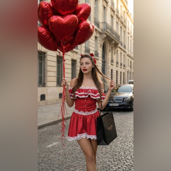 Chic red polka dot dress with off-shoulder design. Features white lace trim for added elegance.
