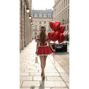 The HUG ME DRESS is a romantic off-shoulder mini dress featuring a red polka dot print, delicate lace trim, and playful ruffle details. Its fitted bodice and flowy skirt create a flirty, vintage-inspired silhouette.