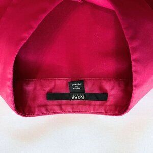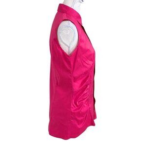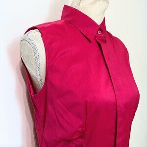 HUGO BOSS BALAINA SLEEVELESS RUCHED BUTTON DOWN BLOUSE, This is a feminine summery chic business formal top in a fuchsia pink for a vibrant top for the office during warm seasons - made of a super stertch and lightweight cotton blend - it's unlined and ruched on each side of the front waistline for a flattering touch for the belly area - collared - button line is hidden for a sleek neat curated look - sleeveless, perfect for spring and summer - can be layered with a blazer or a cardigan for colder days and season - perfect for business, business casual to casual vacation days as its's small and easy to pack - hard to wrinkle (not resistant but almost). Go to top. Must have.