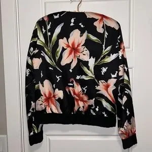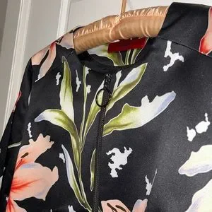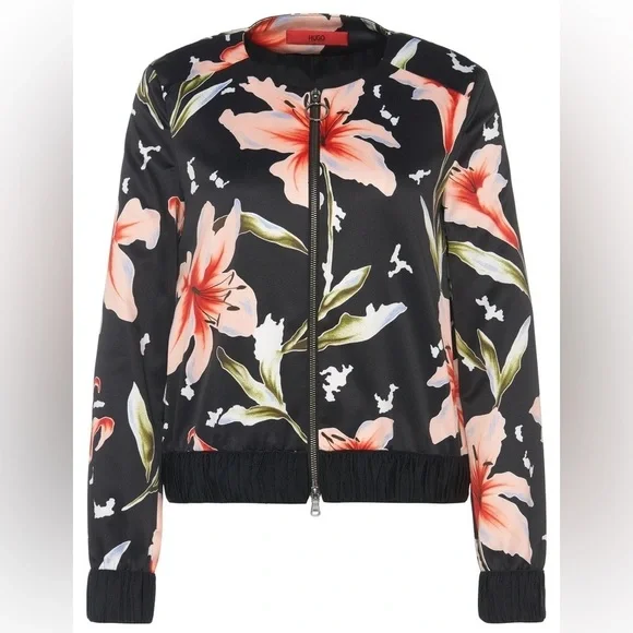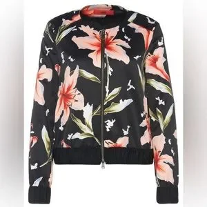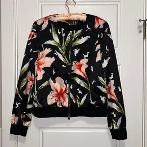 Large floral all-over pattern jacket designed in casual blouson style with elasticated cuff borders at the hem and sleeves.
