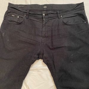 Hugo Boss men’s black jeans style pants. Straight fit, zip fly, faint black on black striped, excellent condition, 85% cotton, 15% polyester