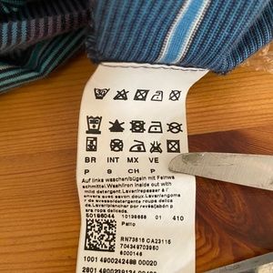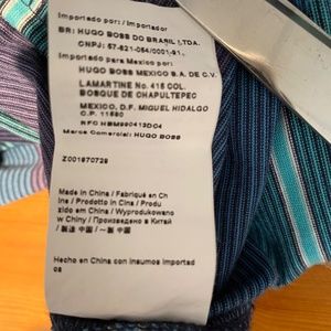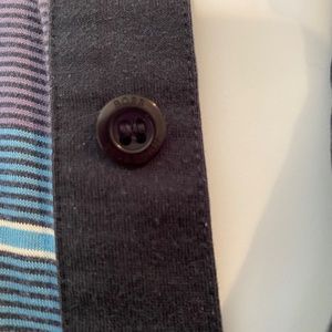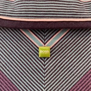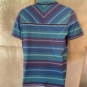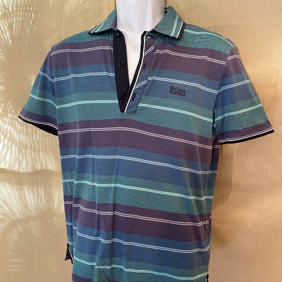 Hugo Boss mens polo shirt sz S. Gorgeous colour combination of turquoise, blue and purple stripes. Three button. Authentic. Logo on chest and under back collar, 100% cotton