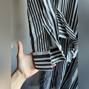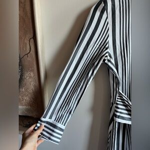 Chic long sleeve dress with bold black and white stripes. Features a stylish tie waist. Ideal for versatile wear.