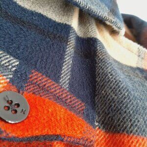 • Fleece blanket style fabric jacket in colourful plaid check pattern with two front pockets and zip details on the sleeve ends.