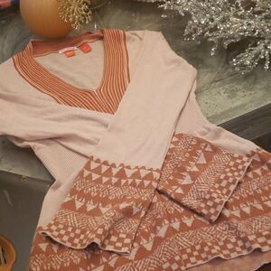 Beautiful long fine gypsy style sweater, fit like M eventough tag says xs, split hem wide sleeves, neutral fall colors, very nice one