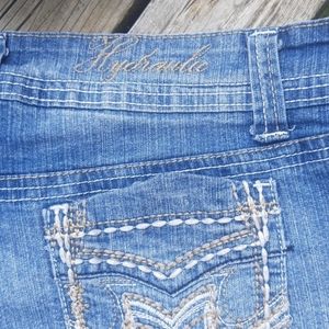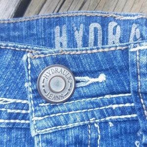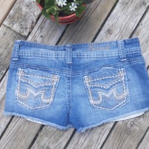 Distressed denim shorts are size 7/8. 5 pockets, cotton/polyester/spandex. 16 " waist lying flat and 2" inseam.