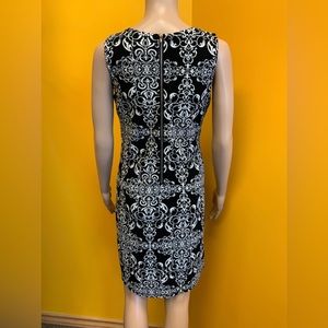 Sleeveless Black Dress With White Pattern. Gold Metal Cutouts at Neckline. Back Zip