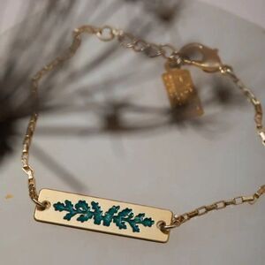 Hadas Jewelry Women's Gold Double-sided Oak Bracelet with "I Am Here" Engraved on the back.