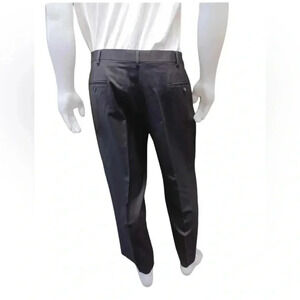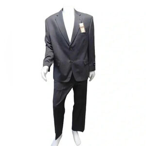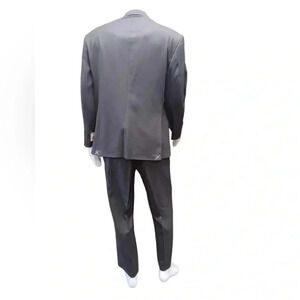 Charcoal in color this suit is brand new. The jacket is fully lined with seven available pockets and a two button closure. The pants have a zipper, clasp and double button closure and two side pockets.