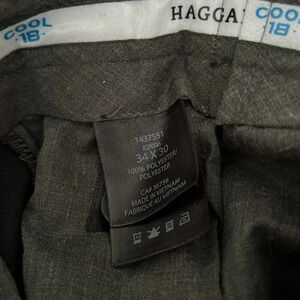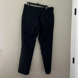 These are classic black dress pants by Haggar, featuring a modern fit and made from 100% polyester. Ideal for formal occasions or office wear. It is in good condition sized 34/30, pants length is 36 inches