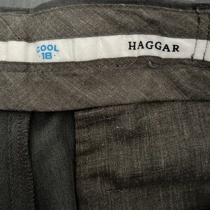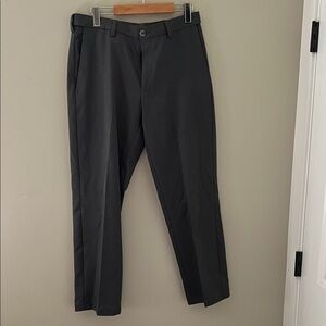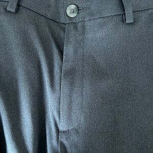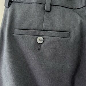 A pair of Elegant dark gray pants featuring a classic fit and a button closure. Ideal for formal occasions or professional settings, sized 32/30 waist length is 16 5/8 inches, hip width is 20 inches and pants length is 38 inches
