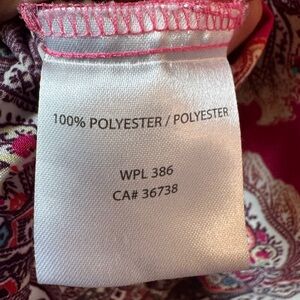 This relaxed-fit blouse from Haggar showcases a vibrant pink hue adorned with an intricate white graphic pattern. The 3/4 length sleeves and flowy fabric ensure comfort and style, making it a versatile addition to any wardrobe.