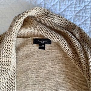 Lightweight knit fabric, part open weave in neutral sand tone.