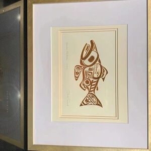 Haida Salmon “SKAGII” by Bill Reid, framed with raised copper image