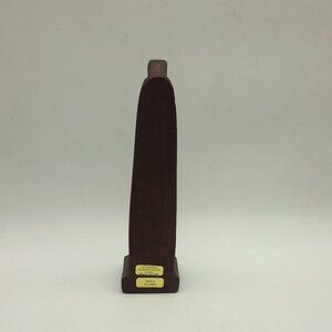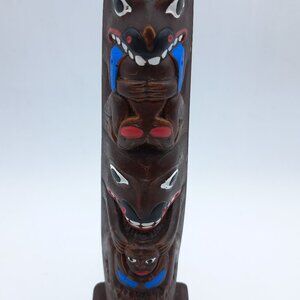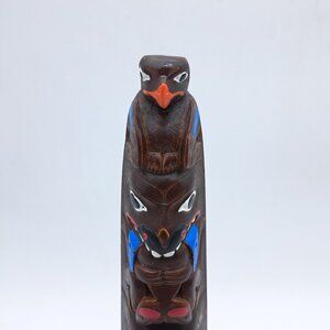 A totem pole made in Alaska and marked "Authentic Alaskan Craft". It replicates the poles made by the Haida people of the Pacific northwest. The pole is topped by an eagle with mythological or demonic creatures below it. The piece is 10 1/2" tall, 2 3/8" deep and 2 1/2" wide.