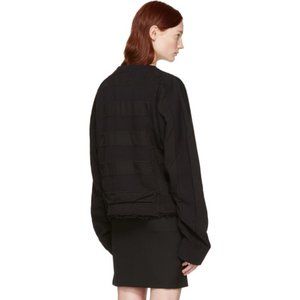 Long sleeve cotton jersey and twill pullover in black. Rib knit crewneck collar and cuffs. Raw edge at hem. Tonal stitching.