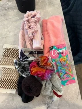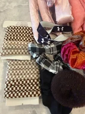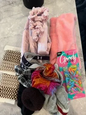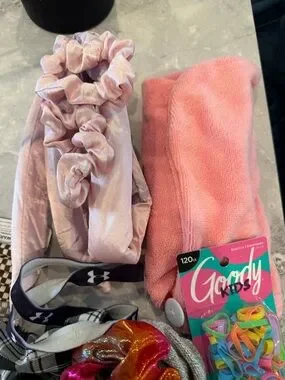 Perfect hair accessory set featuring a soft pink plush headband and matching pink satin scrunchies. Includes multicolored elastic bands, metallic rainbow scrunchie, black hair donut, patterned headbands and sport elastic. Easy to use and gentle on hair. Bright pink elements add playful color to any hairstyle.