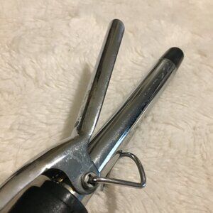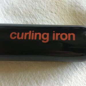 Good preowned condition self-proclaimed curling iron for hair. I'm unsure what the brand is. Black, with a red logo and silvery chrome curler. Functional, but certainly not high end. Corded.