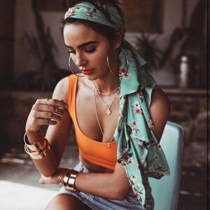 Beautiful stamped silk scarf that I bought at a boutique and always used as a hair accessory while travelling. I have unruly curls and I like to spend looooong days at the beach which leaves me scrambling to get dressed quick before dinners out while on vacay. Hair wrap to the rescue. See stock photos for styling ideas. Selling this one because I am ready to rock a new print I just purchased. There are a few teeny snags or pinpoint holes (pictured) that are not seen when all tied up but still wanted to disclose. Super soft silk that Ake dries really quick. Can also be used as a bag accessory (looks great on straw bags) or even as a belt in a pinch. 😉