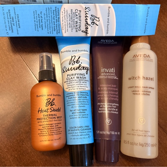 Set of hair care products. Includes heat protection spray, curl defining cream, and more. Perfect for hair styling and care.