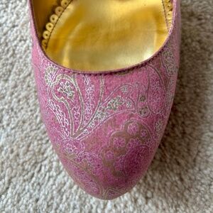 These Hale Bob “Rosy”size 10 shoes are brand new, in the box, and have never been worn. These beautiful shoes are pink with a gold metallic brocade pattern.