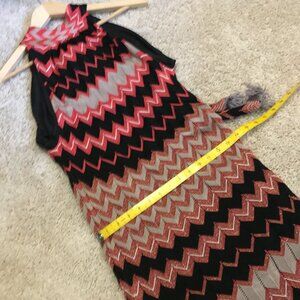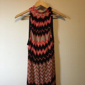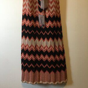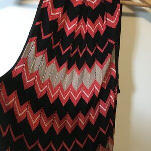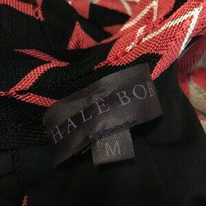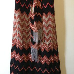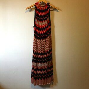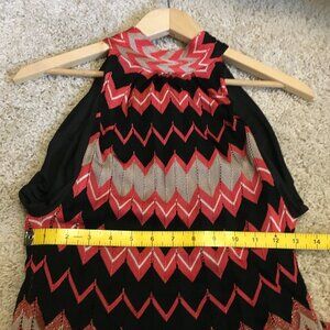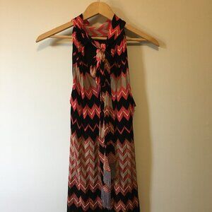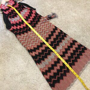 Very good preowned condition Hale Bob zigzag pattern, halter neck, tassel tie up dress by Hale Bob in orange, black and beige/grey. The fabric is pleated all around. A few of the tassel strands have seen better days, but for the most part they are alright and the dress is in great condition.