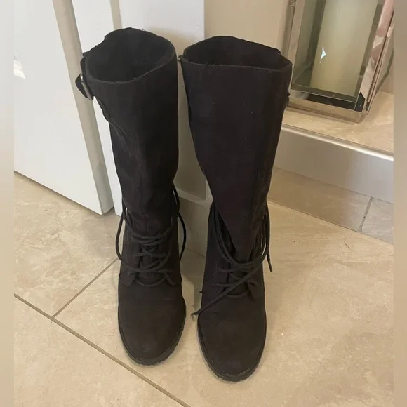 Cute half cut boots with buckle detailing and lace ups. Material is like suede. Size 8.