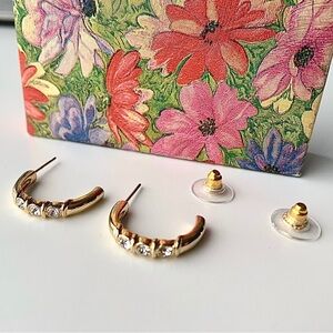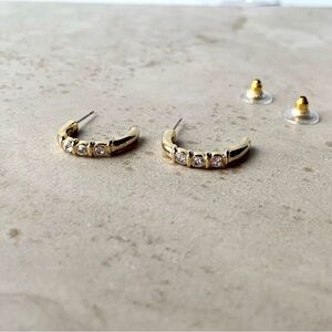Gold tone half hoop earrings accented with 3 rhinestone beads. Steel posts.