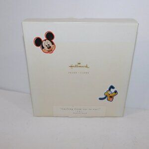 This Hallmark Disney Mickey Mouse Hands "Smiling to Ear to Ear" Picture frame is in NEW open box condition. Picture area measures 3"x 3" - total frame area is 6.75" x 6.75". Features loop on back for hanging and stand for desk top. Frame has "Smiling from Ear to Ear" in writing along bottom, with Red Back matt embossed with mickey heads throughout with yellow and blue along bottom and Mickey Mouse hands in 2 corners.