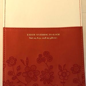 Soft leather-bound with leather pouch on cover that holds phone, keys, pen, etc