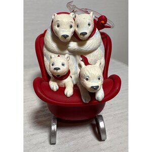 A charming collectible ornament showcasing a polar bear family in a red sleigh with a cardinal accent, featuring sound for added holiday cheer.