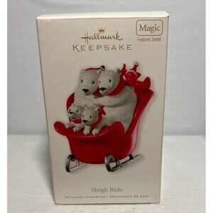 This Hallmark Keepsake ornament features a charming polar bear family in a sleigh. It plays "Sleigh Ride" by Ella Fitzgerald, creating a festive atmosphere. Crafted with attention to detail, this ornament is perfect for adding a touch of holiday magic to your decor.