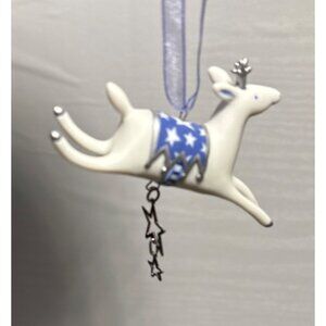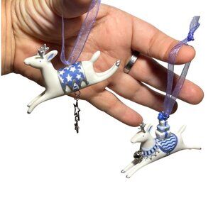 Hallmark Reindeer Ornament Set 2001 Porcelain Blue White Stars Ribbon Hangers 3"