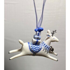 This Hallmark 2001 porcelain reindeer ornament set features intricate blue and white detailing, elegant gift and star accents, and durable ribbon hangers for secure display.