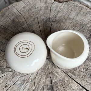 Off white colour with adorable, whimsical detailing. Pour pour pour on creamer and sprinkle sprinkle sprinkle on sugar bowl, yum in lid. In like new condition, these are so adorable!