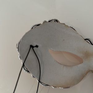 Beautiful Halloween or costume mask. Silk rose 🌹, feather 🪶 and ribbons adorn the side of the mask. Orange mask with silver and black adornments. Great shape. Adjustable strap. Velvet lined on the inside.