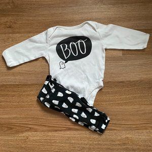 Baby gender neutral halloween "boo" set. Has some wash wear/fading but otherwise in good condition.