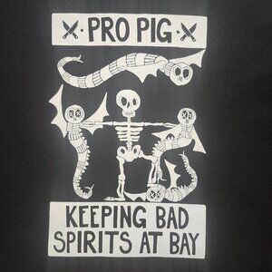 Get into the spooky season with this unique black crewneck sweatshirt featuring a bold "PRO PIG – Keeping Bad Spirits at Bay" skeleton graphic. Perfect for Halloween or anyone who loves gothic, punk, or alternative streetwear style.