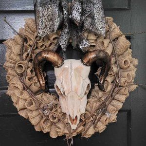 18 inch round wire frame. Hand made by the Wreath Lady. Brand new. Burlap mesh fabric done in curls. A plastic cow skull is the center piece. It's been hand painted by me, and then sealed. The twigs have all been sealed. On top sits a fancy bow that balances the whole wreath.
