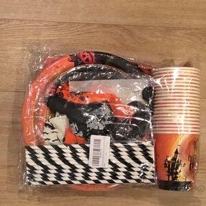 Brand new Halloween party supplies. Comes with set of 20 paper cups, 20 paper dinner plates and 20 paper dessert plates. 20 stripped black and white paper straws. 12 assorted coloured Halloween theme balloons with ribbon and tape. Also includes a 60” x 38” fabric “Happy Halloween” tapestry. Perfect for photo backdrop. Has grommets to hand and includes ribbon.