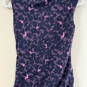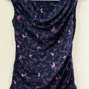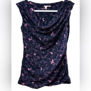 Stylish tank top with a draped neckline. Black base with pink floral pattern. Perfect for casual outings.