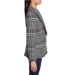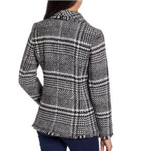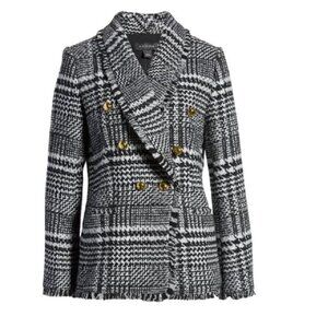 Add rich texture and heritage patterning to any workday look with this plaid tweed jacket with fringe edges and gleaming goldtone buttons.