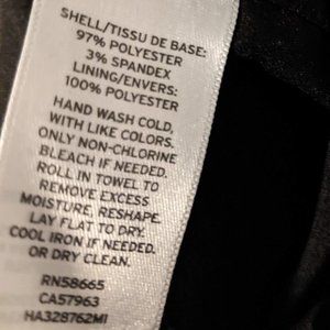 Shell is 97% Polyester and 3% Spandex with the lining being 100% Polyester