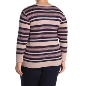 A stripe print adorns a knit constructed cardigan featuring an open front for an outfit completing piece.