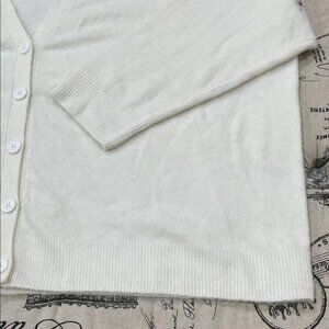 Chic cream cardigan with button-up front. Features subtle embellishments on shoulders. Ideal for layering.