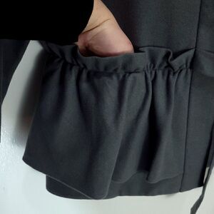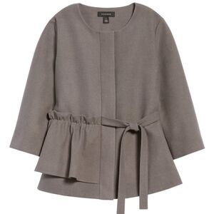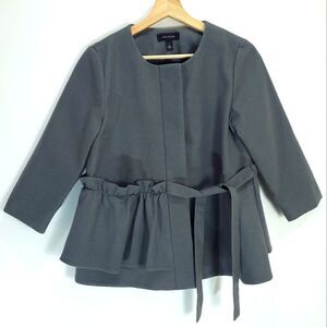 Lovely soft gray ruffle jacket from Halogen in nearly new condition, worn once. A ruffled peplum overlay partially wrapping the tie-front waist gives chic new shape to a jacket tailored from a cozy brushed fabric. Size XS. Frill gather edge large front pocket on left side only. This tier and frill detail wraps around to the back also. Right front side has 2 straps that you can tie to cinch the waist in a little if you like. Super soft felt feel rayon poly blend. Concealed buttons down the front.