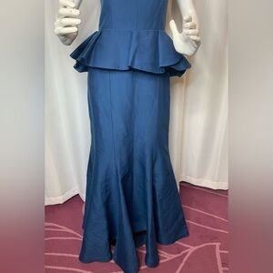 Halston Heritage sateen gown with peplum waist. Halter neckline with button snap at neck; open back. Sleeveless; cut-in shoulders. Trumpet silhouette. Hidden back zip. Floor skimming hem. Fully lined.